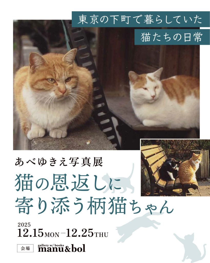 そのアフター写真展として、2025年12月15日(月)より期間限定で、『猫の恩返しに寄り添う柄猫ちゃん』をmanu&bolにて開催いたします。あべゆきえ第2弾写真集『猫の恩返し』に掲載されている写真の中から厳選して展示いたします。