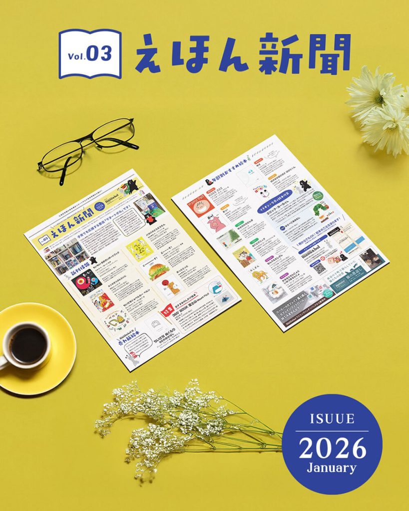 毎月、絵本の新刊情報や年齢別のおすすめ絵本、月替わりの絵本作家さんの紹介など、絵本にまつわる情報をみなさまにお届けいたします。「えほん新聞」はマヌートボル店頭で配布しておりますが、遠方にお住まいの方でもお読みいただけるよう、下記の「えほん新聞を読む」ボタンからもご覧いただけます。